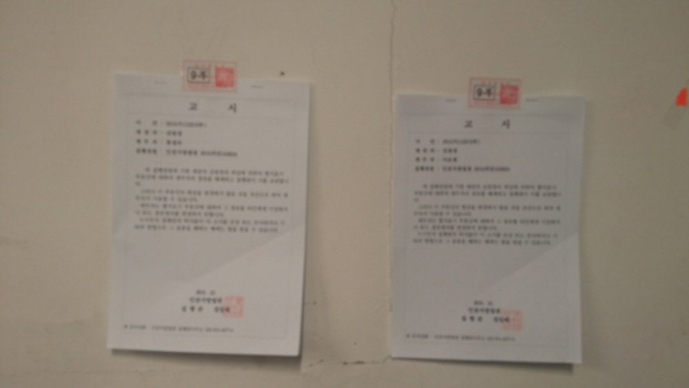 임대목적물 내부 벽면에 점유이전금지가처분 고시문 부착 사진 / 집행관의 가처분 집행 페이지 정보 작성자 (220.♡.167.96) 작성일18-03-29 18:50 조회4,579회 댓글0건 관련링크 이전글 다음글 목록 본문 임차인 1명, 무단전차인 1명을 상대로 점유이전금지가처분신청을 하고 결정을 받아 집행관으로 하여금 가처분집행을 실시함집행관은 집행목적물 내부에 "점유를 타인에게 이전하지 말라'는 취지의 고시문을 내부벽면에 부착함,채무자가 2명이므로, 각 1부 씩 부착하였음 댓글목록 등록된 댓글이 없습니다. 이전글 다음글 목록