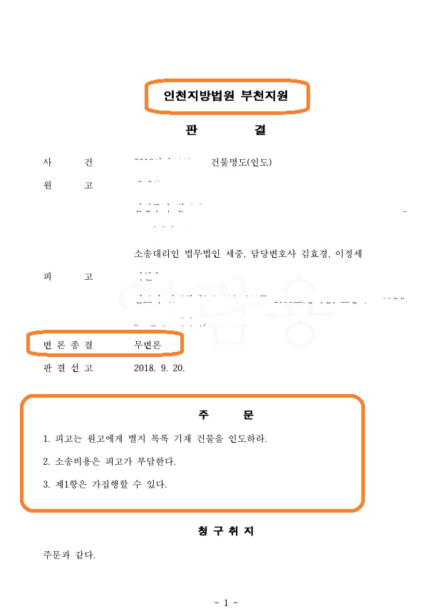 명도소송(무변론 판결) 페이지 정보 작성자 (14.♡.133.23) 작성일20-04-29 17:17 조회2,475회 댓글0건 관련링크 이전글 다음글 목록 본문 인천지방법원 부천지원 명도소송 사건건물 임차인이 월차임을 연체하여 임대차계약을 해지 후 명도소송을 제기함임차인이 명도소송송장 부본을 송달 받았으나 답변서를 제출하지 않았음 임차인이 자백한 것으로 간주하여 무변론 판결성고함 댓글목록 등록된 댓글이 없습니다. 이전글 다음글 목록