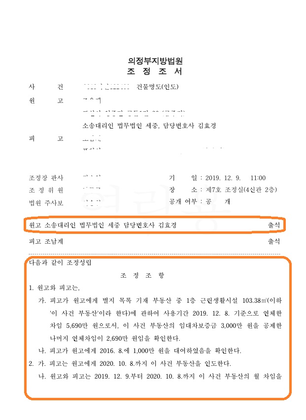 명도소송 임의조정 성립 페이지 정보 작성자 (14.♡.133.23) 작성일20-04-29 17:18 조회1,856회 댓글0건 관련링크 이전글 다음글 목록 본문 상가 임차인이 월차임 3기 이상을 연체하여 계약을 해지한 후 명도소송을 제기하였음임차인과 소송 중 원만하게 합의하여 임의조정 성립함 댓글목록 등록된 댓글이 없습니다. 이전글 다음글 목록
