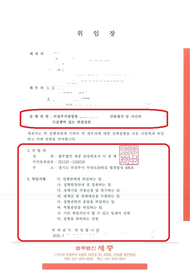 건물철거 인도집행 위임장(대리인 법무법인 세중) 페이지 정보 작성자 (14.♡.133.23) 작성일20-04-29 17:23 조회3,909회 댓글0건 관련링크 이전글 다음글 목록 본문 임대인 스스로 건물철거 및 토지인도 소송을 제기하여 판결을 받은 후본 법무법인에 건물철거 및 토지인도 강제집행 사건을 의뢰한 사례집행신청시 첨부하는 본 법무법인의 강제집행 위임장 댓글목록 등록된 댓글이 없습니다. 이전글 다음글 목록